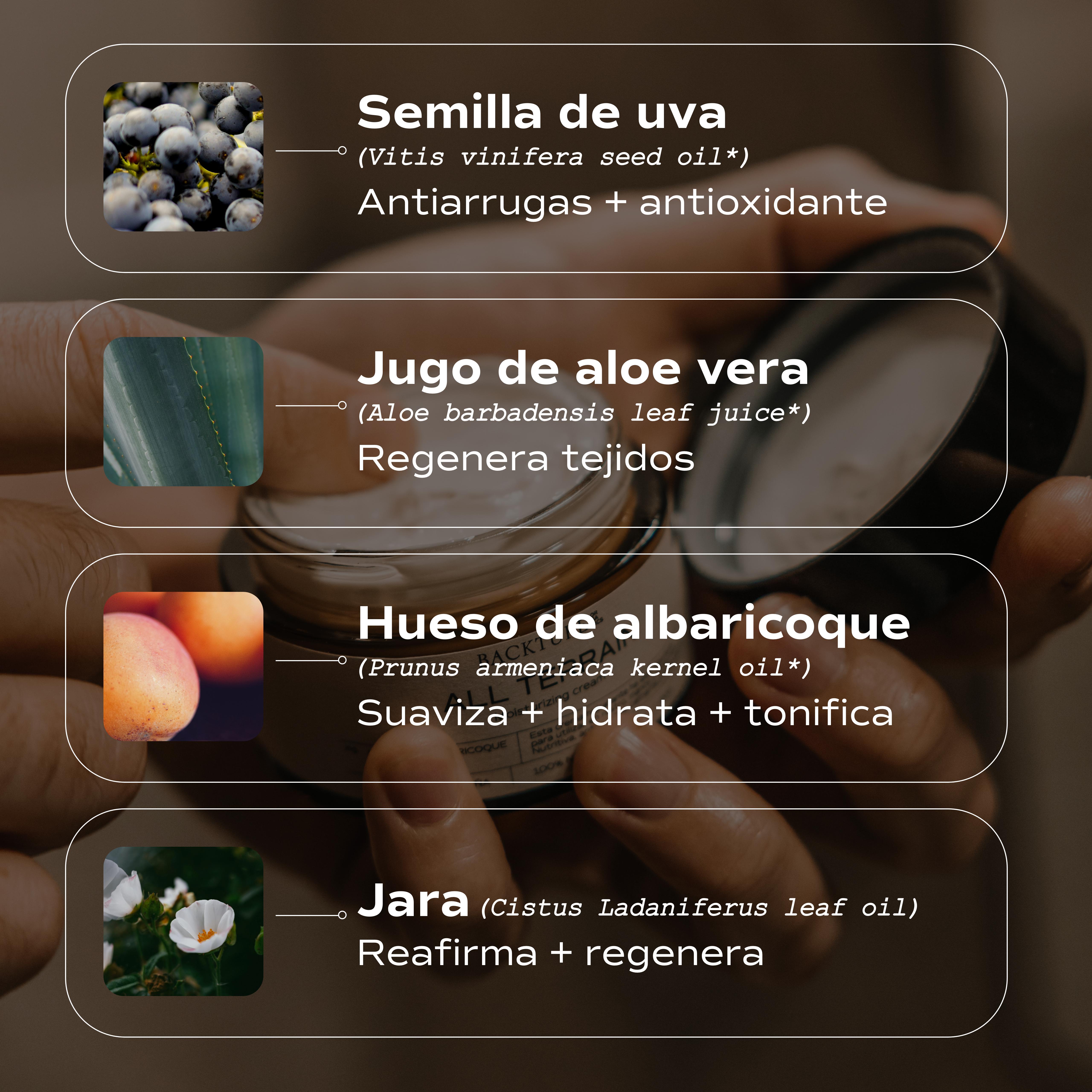 With Resveratrol, the molecule of eternal youth. Lignin enzyme, vitamin A, omega 6 and linoleic acid that soften, hydrate and protect the skin from the deepest layers.
