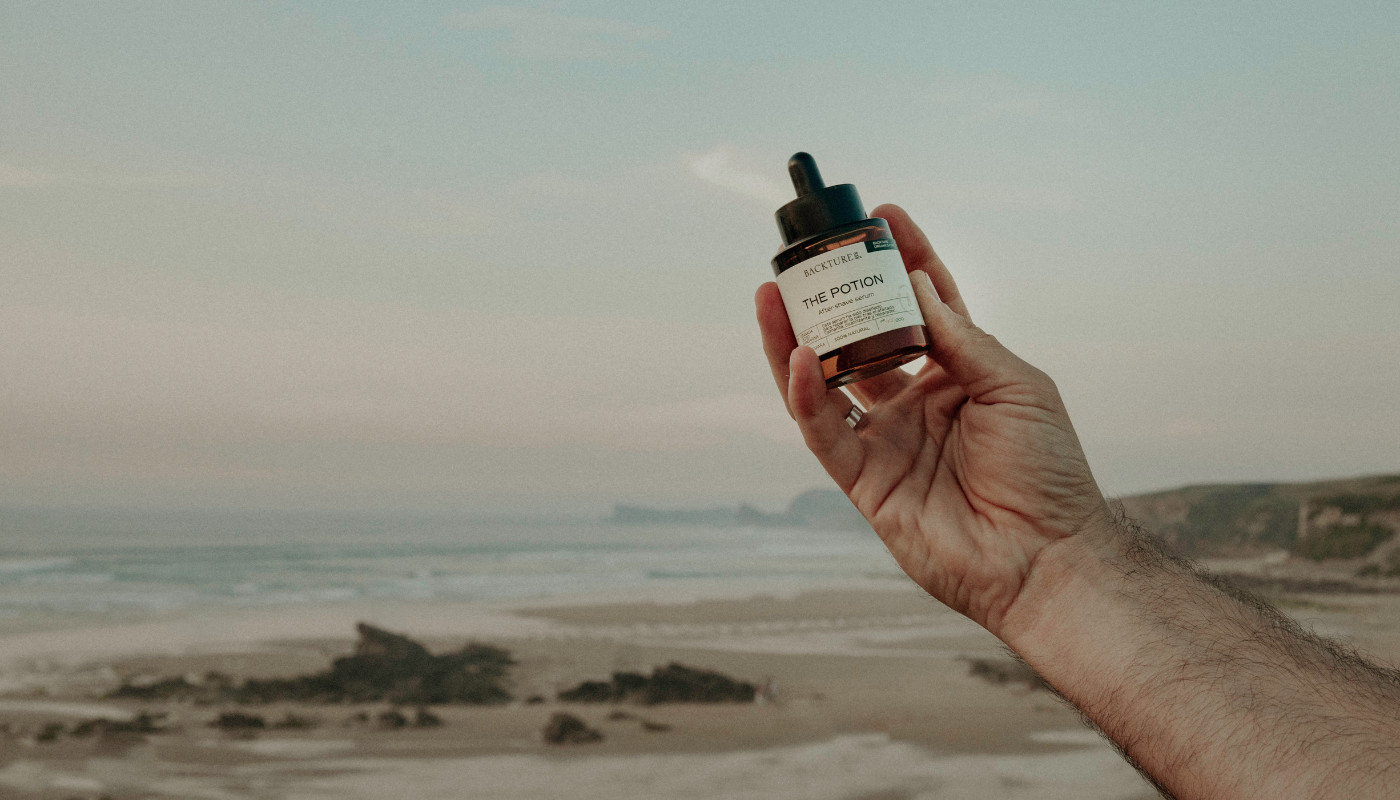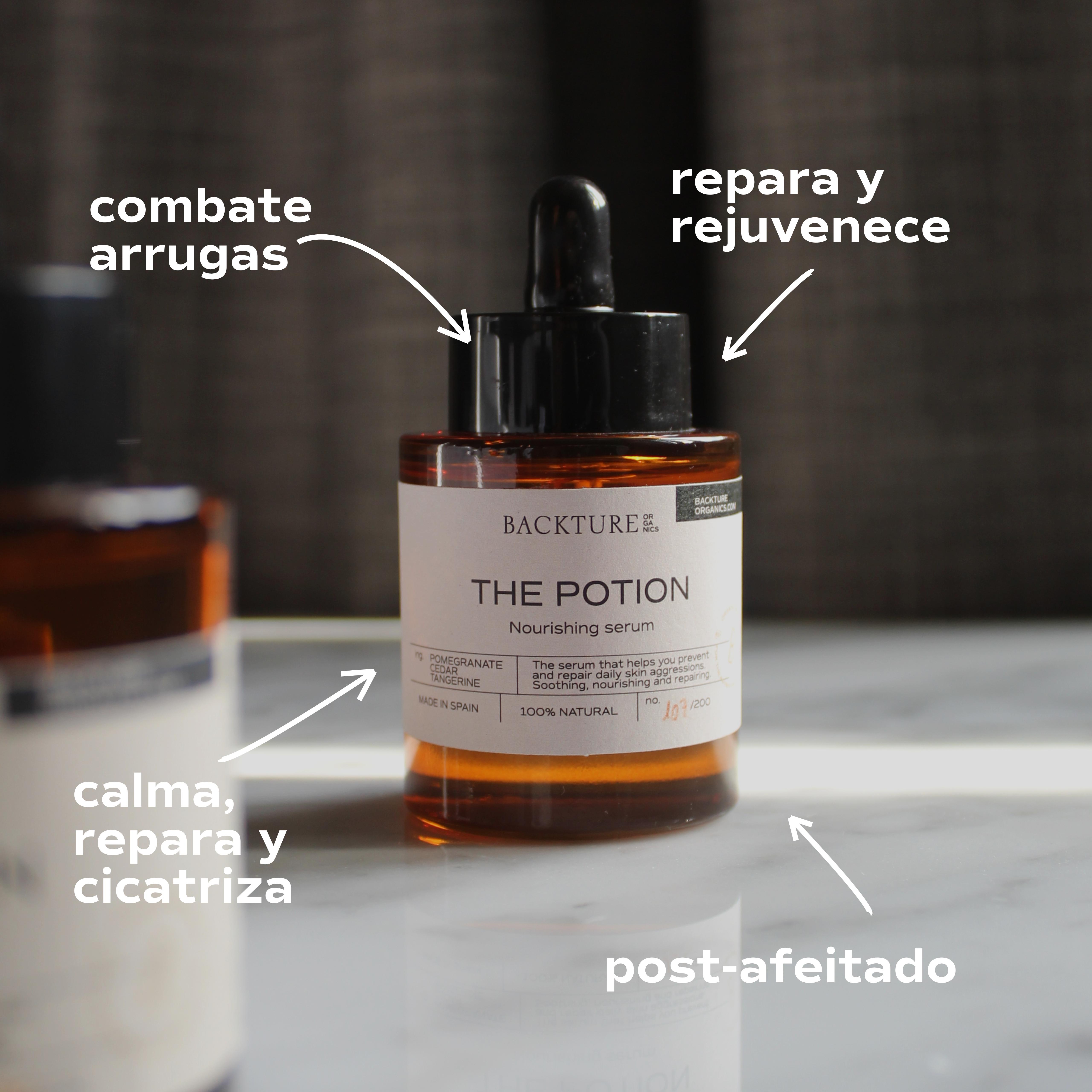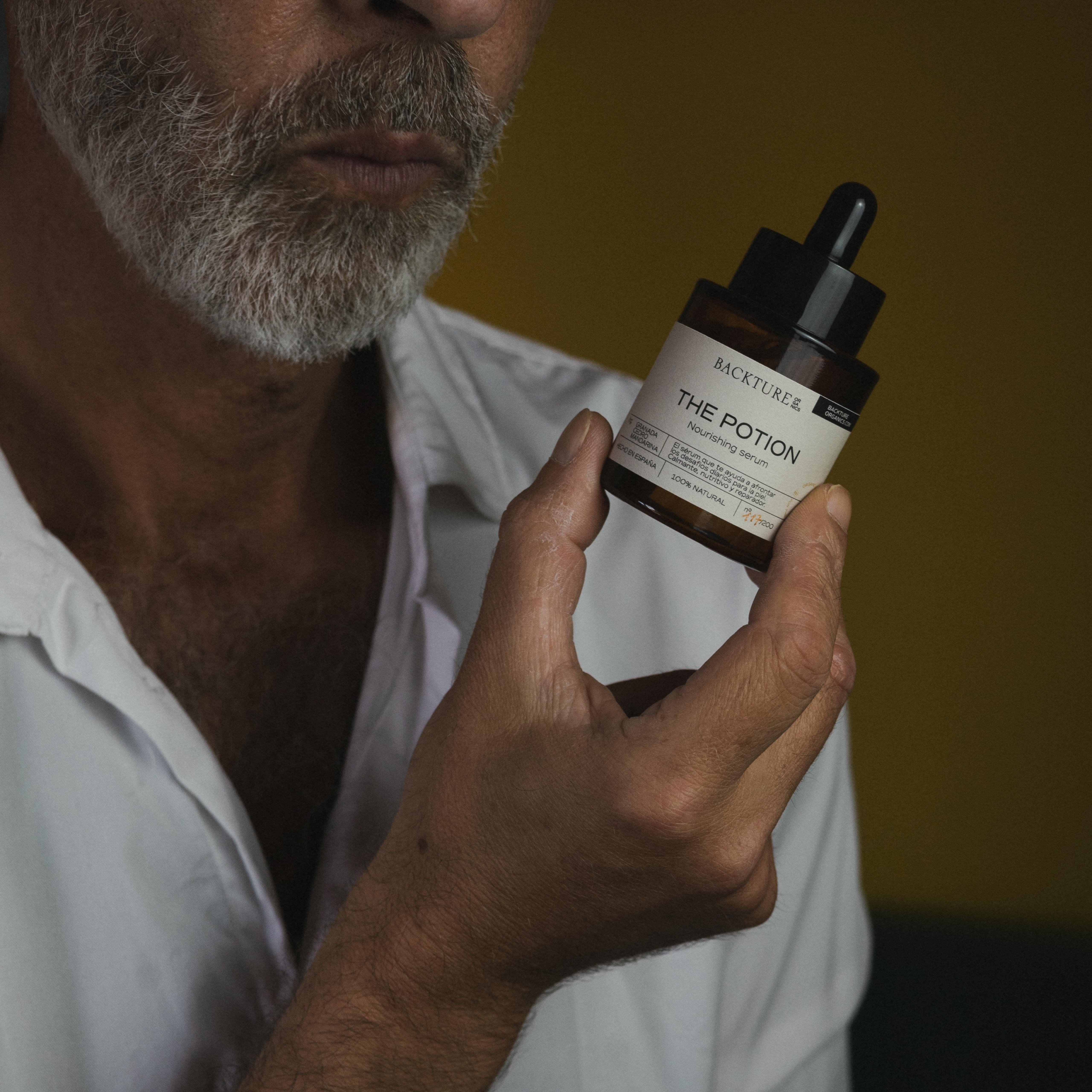 THE POTION, a 100% natural facial serum for men, delves deep into your skin's layers, providing hydration and repair from within.
